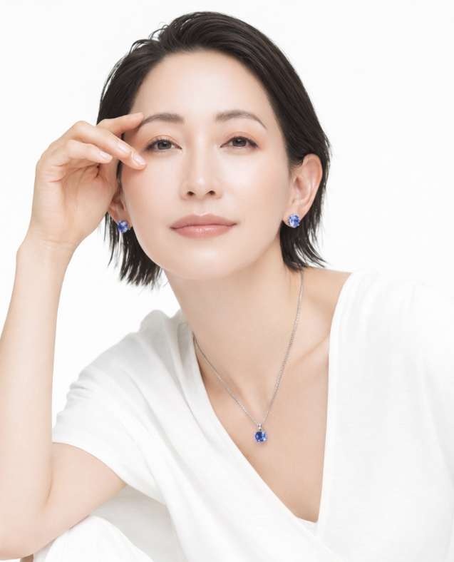 シンプルな白のトップスは、色石が映えるベストパートナー。